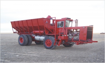 "It gets grain out of the field fast and frees up a tractor," says Gerald Bruner, Conrad, Mont. He and his son, Brad, built a self-propelled grain cart using the frame of a 25-ton Mack "rock truck" used to haul rocks out of mines. It?s equipped with a home-built 900-bu. hopper on back that measures 20 ft. long by 13 ft. wide. It travels at speeds up to 28 mph.