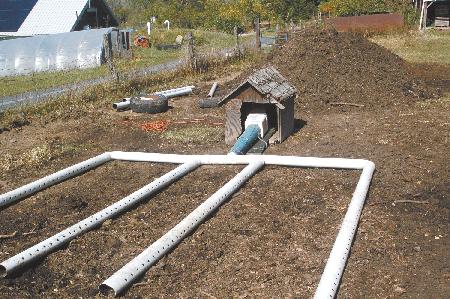 Static composting requires air blown through the pile, so he started with a used squirrel cage furnace fan. He used a square plastic bucket and some aluminum sheeting to funnel air from the fan to 4-in. dia. pvc pipe.