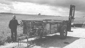 He started with a Knight 250-bu. spreader that already had the beaters removed. He removed the pto shaft and shortened up the pto drive chain that originally operated the apron, then mounted a hydraulic motor on front of the spreader. The motor drives the apron. To power the spreader -- and the splitter on back -- he mounted a 12 hp, electric-start gas engine equipped with a 2-stage hydraulic pump on the tongue.