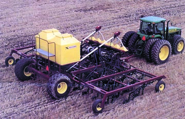 Seed Hawk one-pass air seeders are built in Langbank, Sask. After watching a 40-footer at work, Scheetz bought one and hitched it up behind his pickup for the 1,400 mile trip home. He used the planter last fall to plant 300 acres of wheat in 12-in. rows and plans to use it this spring to plant corn and beans, also in 12-in. rows.