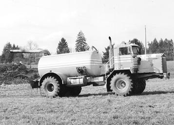 "It's the heaviest-built manure spreading truck I've ever seen yet it causes almost no compaction because of the big flotation tires," says Cornell Van Jaarsveld, Duncan, B.C., about the articulated 4-WD mining truck he converted to haul manure. He uses it year around to spread dairy manure for 25 customers.
