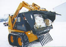 Omann says he's made five different models for small and big skid steer loaders. One model is equipped with a 5-ft. bucket and 2-ft. long coiled Danish teeth. He's also made a model that can be bolted onto an existing bucket. And he has experimented with buckets that have slotted floors to let more dirt and trash fall through. He's now testing a spring tooth model. It pressures the rock out of the ground and won't dig out rocks over 2 ft. in diameter. If a tine bends it can easily be straightened using an 8-ft. long steel pipe.