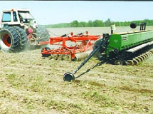 Drill Cultivator Combo: The 20-ft. spring tooth cultivator, roller, and 3-pt. Great Plains drill all mount on a carrier that hooks up to the tractor drawbar. The carrier is sup-ported by a pair of 4-ft. high wheels and an 8-ton axle and spindles off a big fertilizer sprayer. The cultivator is equipped with 15-in. long S-tines that level the soil, wiping out wheel tracks.