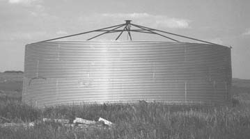 The bin measures 36 ft. in diameter and 12 ft. high and holds 10,000 to 13,000 bu. The roof is simply a layer of plastic stretched tight over a peaked steel frame, while the floor consists of a layer of plastic on top of a gravel and clay base. The sides consist of four 3-ft. high rings of corrugated steel bolted together.