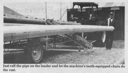 You just roll the pipe on the loader and let the machine's tooth-equipped chain do the rest. It has nylon teeth that won't mark the pipe and are spaced to handle up to 10-in. dia. pipe. The chain runs slowly in either direction and can be stopped, as needed, allowing you to couple lengths of pipe as they're unloaded off the trailer.