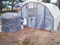 At one end of the greenhouse, she built a 5-ft. dia. compost pile using a wire mesh frame reinforced with steel pipes. Polyethylene sheeting lines the sides and covers the top to hold in heat and retain moisture. The pile itself consists of harvested cover crop, wood chips and a small amount of manure. A 5-gal. metal reservoir, partially filled with water and containing a sump pump, is buried deep within the pile. Black plastic pipe coiled through the pile is connected at one end to the sump pump. At the other end, it exits the pile and connects to a length of insulated hose that runs to growing tables in the greenhouse.